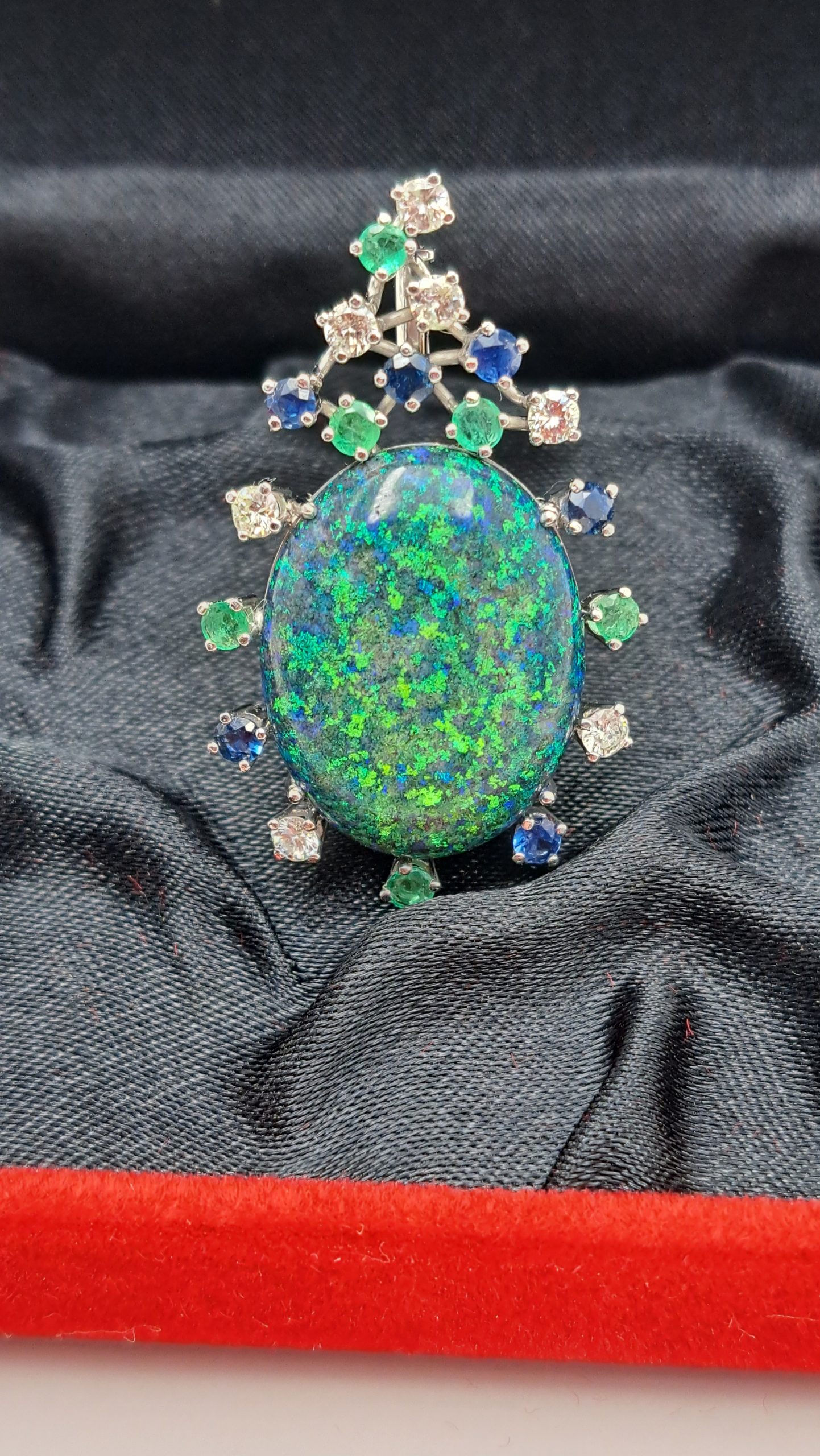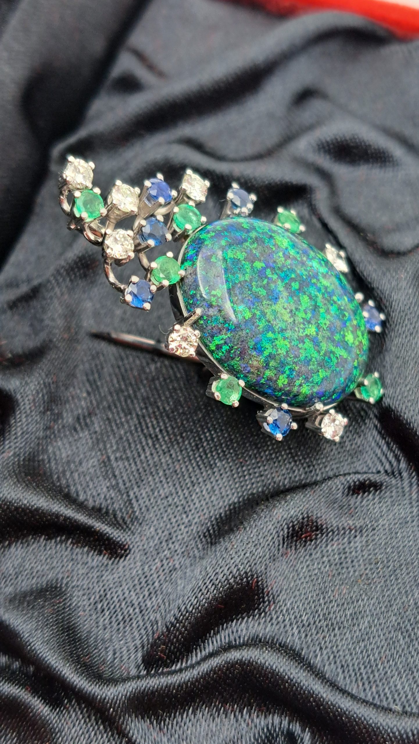 Besetzt mit 7 Brillanten, 1 Opal, 6 Smaragden und 5 Saphiren.
